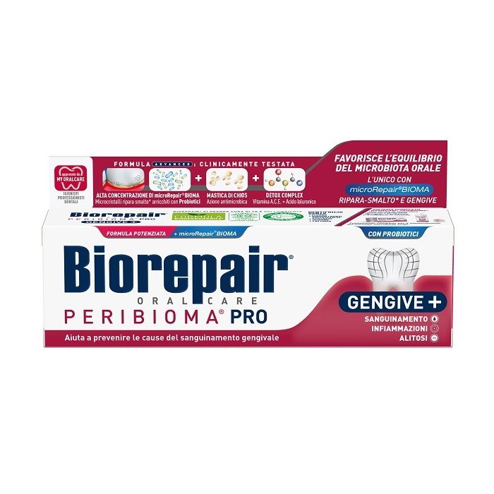 Dentifricio con microRepairBIOMA potenziati con probiotici ad azione innovativa, per prevenire le infiammazioni e sanguinamento gengivale e favorire il mantenimento del normale microbiota orale. Il dentifricio Biorepair Peribioma inoltre ripara lo smalto e protegge il bordo gengivale dall'attacco dei batteri, grazie all'azione combinata di zinco PCA e mastica di Chios. La formula è perfezionata da un complesso vitaminico con acido ialuronico ad azione detossificante, antiossidante e riepitelizzante sui tessuti gengivali.