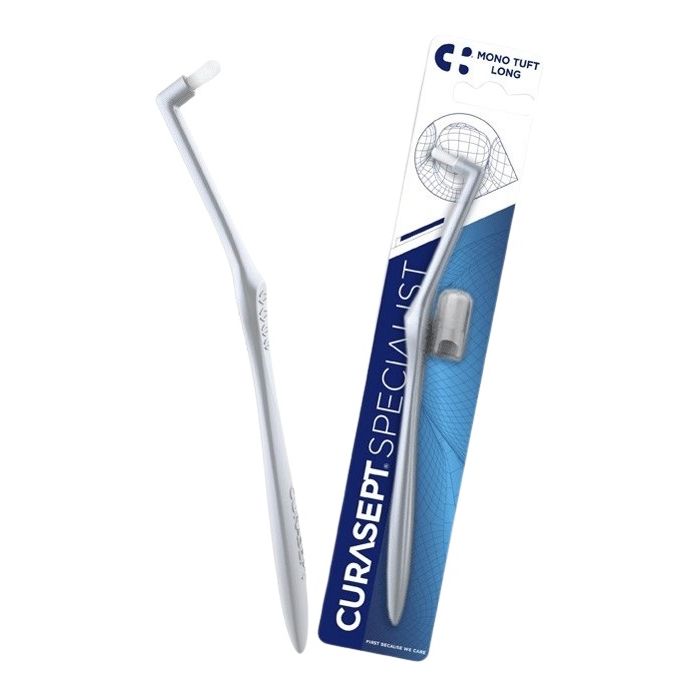 Lo spazzolino Monotuft Long consiste in un unico ciuffo circolare dalla forma conica, costituito da setole morbide e flessibili.