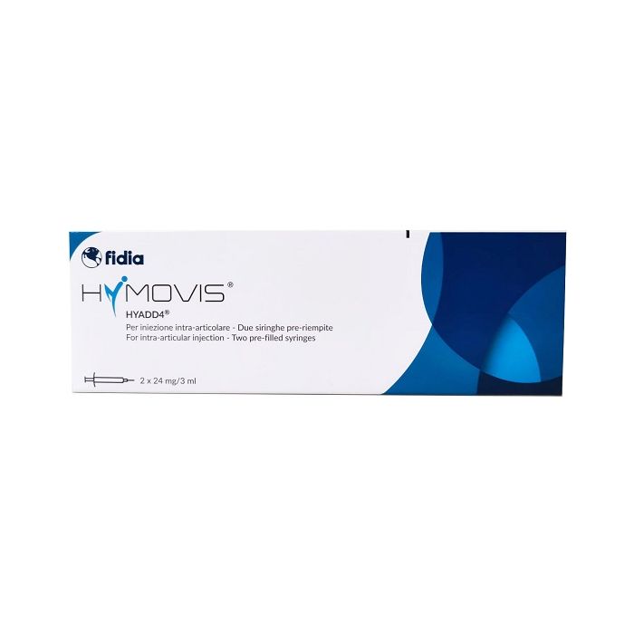 Idrogel sterile, prodotto con Hyadd4 (esadecilammide di sodio ialuronato naturale altamente purificato ottenuto da fermentazione batterica) in soluzione isotonica tamponata. Grazie all’alta viscosità ed elasticità data dall’esadecilammide di sodio ialuronato, HYMOVIS migliora la funzione lubrificante e di assorbimento degli urti del liquido sinoviale, proteggendo la cartilagine e i tessuti molli dalle lesioni meccaniche. Queste proprietà, unite alla prolungata permanenza nelle articolazioni, permettono a HYMOVIS di alleviare il dolore e di migliorare fino a sei mesi la funzione articolare nell’osteoartrosi di qualsiasi natura, lieve o moderata, dell’anca e del ginocchio.